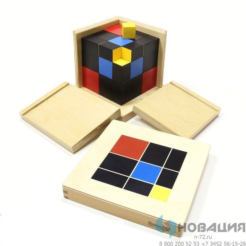 Из элементов набора можно собрать куб (триномиальный или биномиальный). Для этого грани одного цвета прикладываются друг к другу. Чтобы получить исходную фигуру, потребуется сравнить размеры деталей. Занятие соответствует методике Монтессори. Наглядно демонстрируются принципы алгебраических формул.