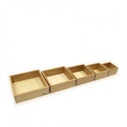 В комплекте для занятий по методу Монтессори 5 коробочек разной величины. Ящики вкладываются друг в друга по принципу матрешки. Ребенок учится сравнивать величину, тренирует глазомер, формирует причинно-следственные связи.