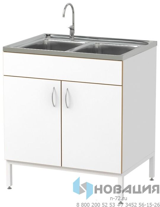 Смеситель с арматурой позволяет подключать холодную и горячую воду. Инвентарь хранится в тумбе с распашными дверцами. Поверхности из ламината (ДСП с термостойким пластиком) не боятся влаги и химических веществ.