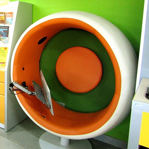 Кресло-шар на металлокаркасе устанавливается в зоне коворкинга или отдыха, а также в кабинете психолога. Это неразборная конструкция на дисковом основании. Опора хромированная. Сиденье плавно переходит в боковые стенки и крышу. На задней стороне шара выделяется круглый элемент с обивкой для поддержания спины.