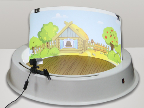Основа для кукольной анимации представляет собой круглый манеж, который комплектуется задником и видеокамерой. Камера фиксируется на округлых перилах и может перемещаться по дуге. На круглую плоскость устанавливается фон и объекты съемки.