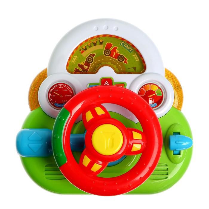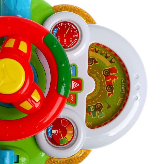 Игрушка в виде автомобильного руля сопровождается эффектами: на корпусе мерцают огоньки, поворотники дополняются звуками, экран крутится, имитируя вид из машины при движении, рычаг переключения скоростей издает гул мотора. Во время занятий ребенок привыкает контролировать свои действия и принимать решения, тренирует память и слух.