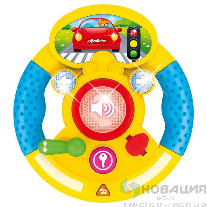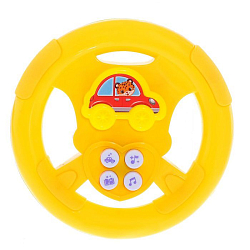 Разноцветная игрушка в виде автомобильного руля научит ребенка координировать свои движения, запоминать последовательность действий. Предлагается имитировать вождение: завести мотор, прибавить газ, посигналить, включить поворот. Руль дополнен звуковыми эффектами.