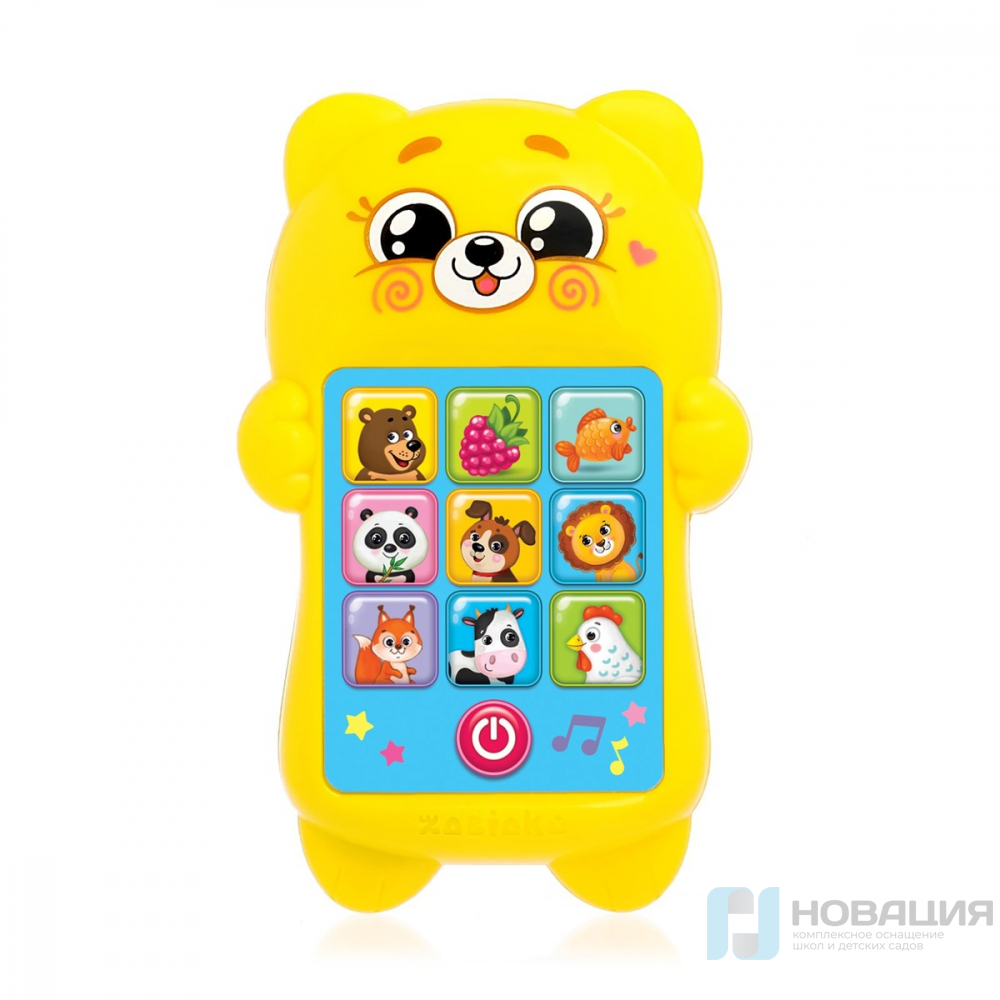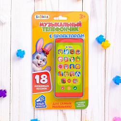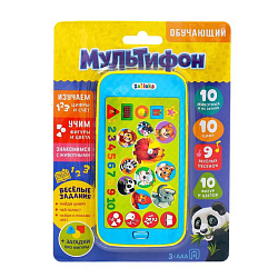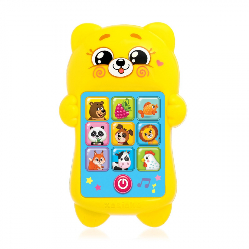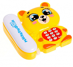 Игрушка в виде телефона сопровождается звуковыми эффектами: после нажатия кнопок с яркими наклейками воспроизводятся записи с фразами (7 шт.), песнями (12 шт.), стихами (7 шт.). 2 батарейки типа АА входят в комплект.
