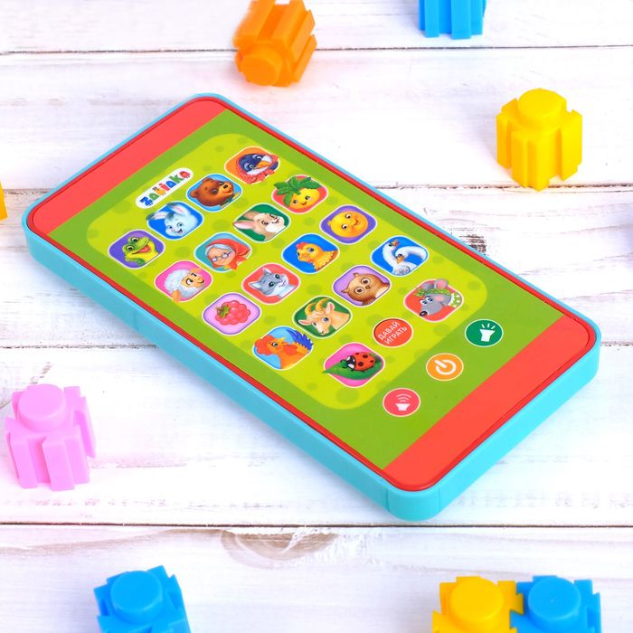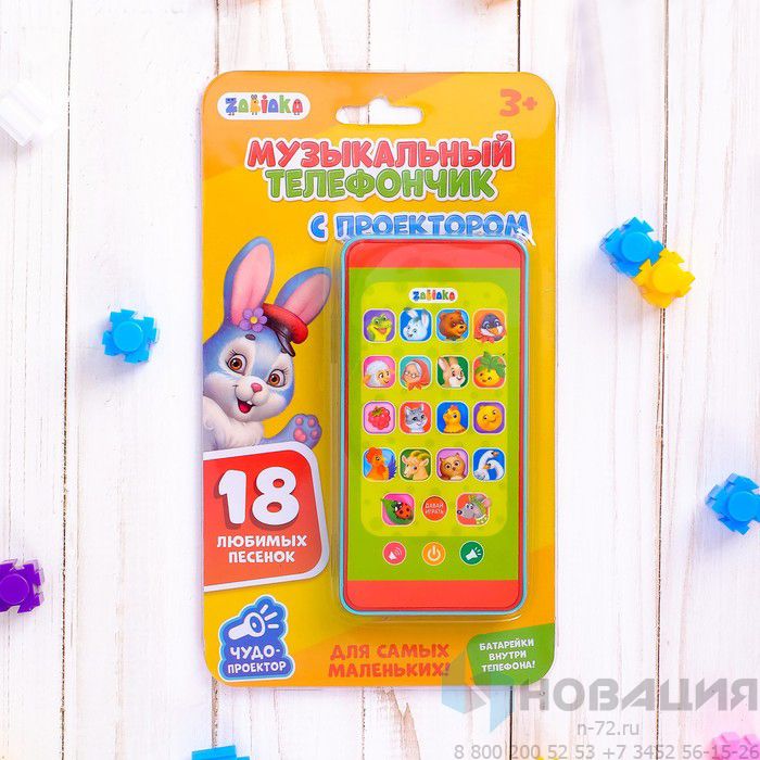 Игрушка в виде телефона сопровождается звуковым оформлением и подсветкой. Для тренировки слухового и визуального восприятия внутрь встроен проектор, воспроизводятся песни и тексты народных сказок. 3 батарейки входят в комплект.