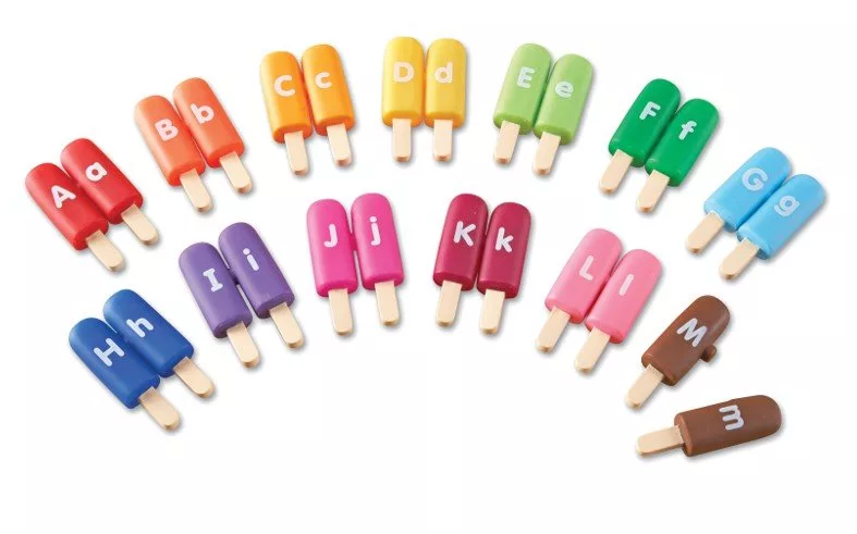 В комплекте 13 пар разноцветных эскимо на палочке размером около 100 мм, на которых изображены заглавные и строчные буквы английского алфавита. В игровой форме дети смогут сортировать эскимо по цвету, по заглавным и прописным буквам.