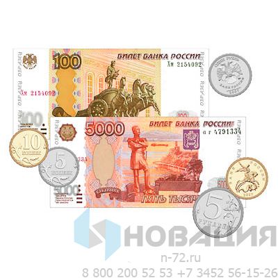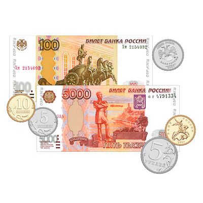 Набор состоит из увеличенных изображений действующих в России денежных знаков, напечатанных на мелованной бумаге и ламинированных глянцевой пленкой. На купюрах сделана пометка «образец».