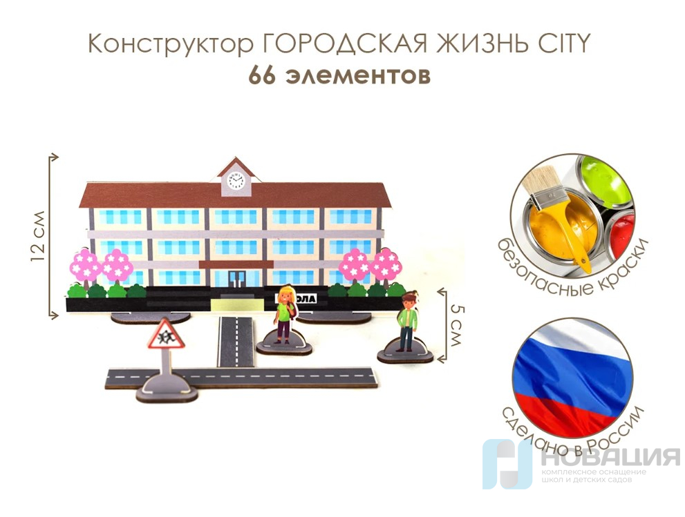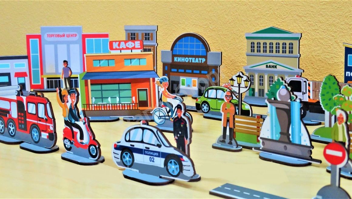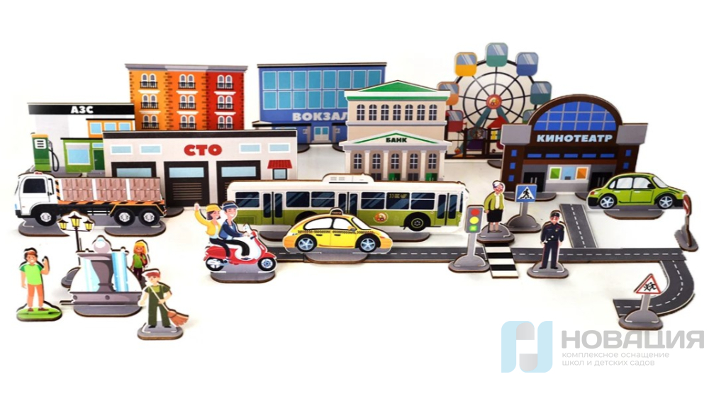 Цветной деревянный конструктор знакомит с инфраструктурой города, помогает расширить кругозор. В конструкторе представлены фигурки для строительства миниатюрных парков, больниц, улиц. Воображаемый город наполнится изображениями людей, машин, дорожных знаков, фонтанов, скамеек, зданий, деревьев.
