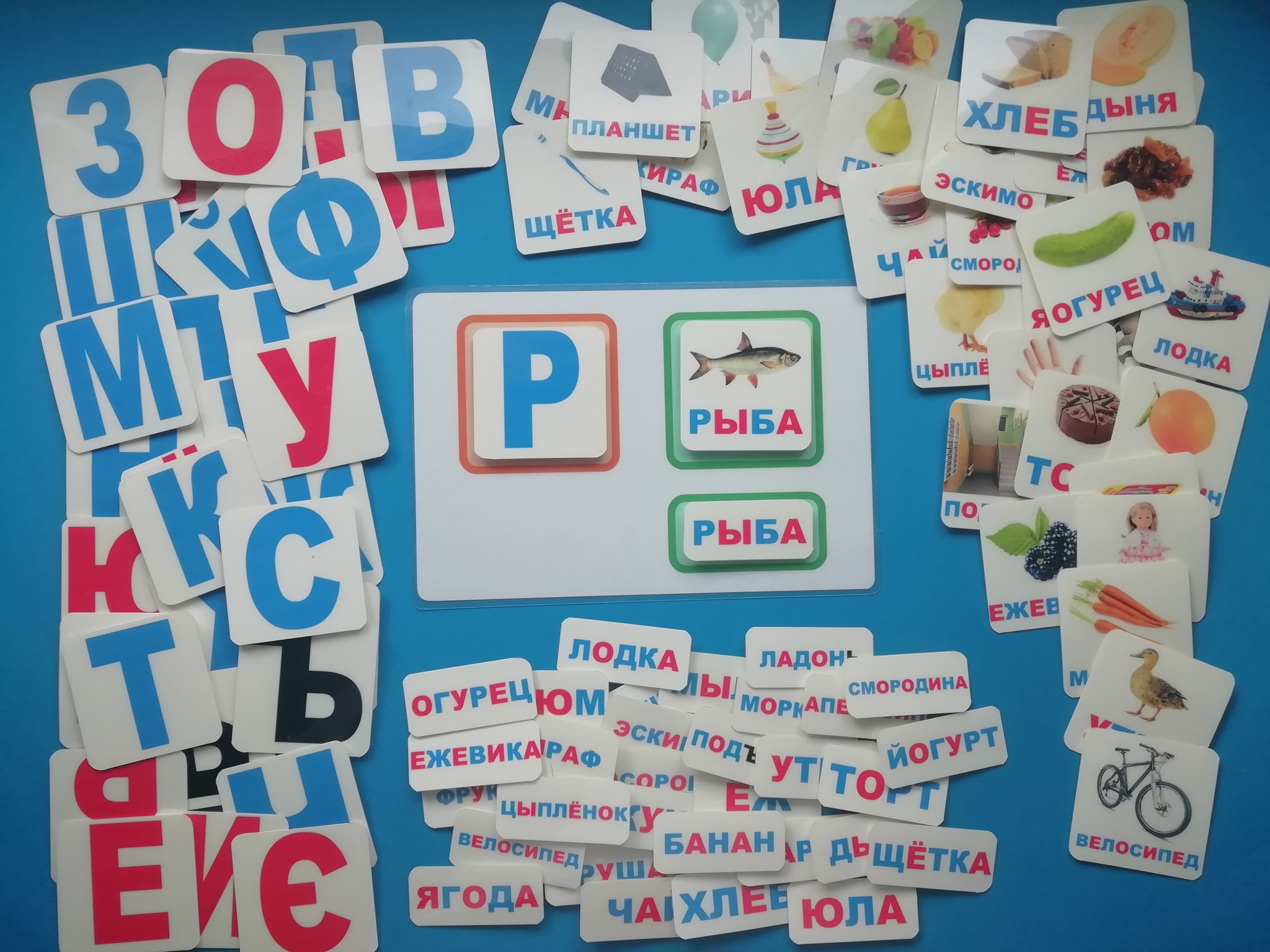- алфавит на съемных карточках: ламинированный лист формата А3 (ДхВ строки 6х30 см) и 44 карточки 4х4 см с буквами,