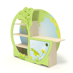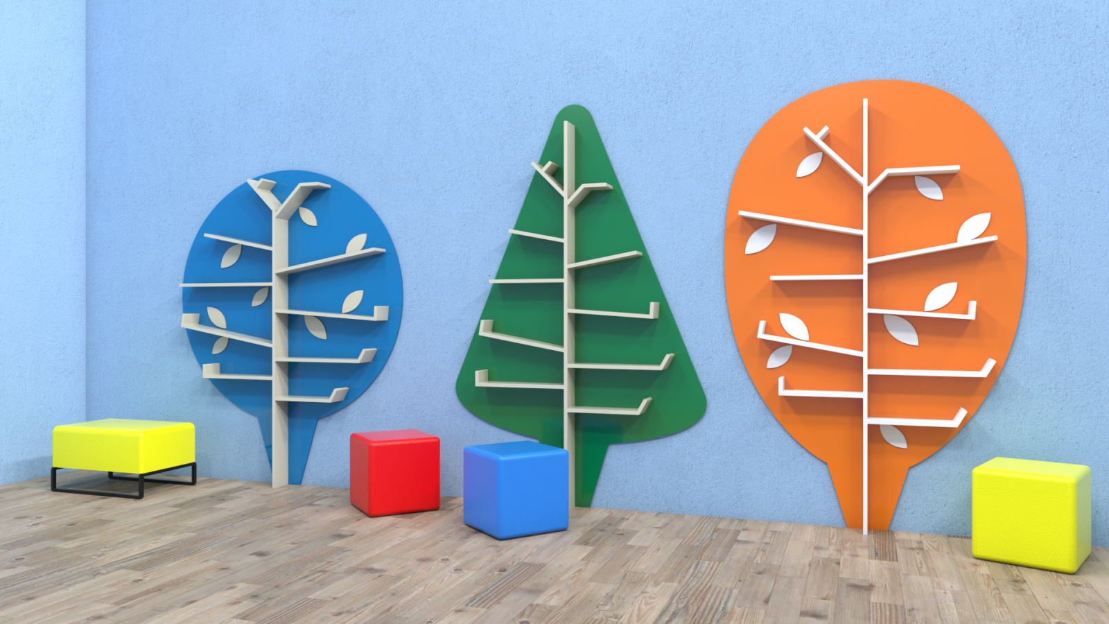 Поверхность покрывается водной краской. На фигурной панели закрепляются полки (по 10 шт.) с ограничителями. Игрушки, книги, канцелярские принадлежности распределяются по причудливым разветвлениям.