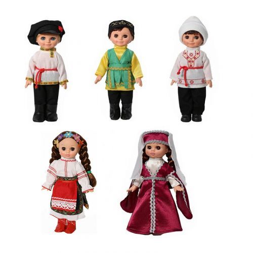 Набор фигурок в стилизованных костюмах используется на занятиях с дошкольниками. Миниатюрная модель человека наделяется типовыми национальными чертами. Куклы подходят для рассказов о культурных особенностях и традициях, дружбе народов, а также для сюжетно-ролевой игры или театрализованной постановки.