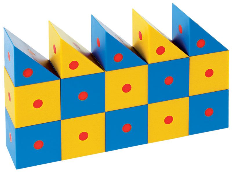 Комплектация: 20 пластиковых магнитных блоков 2-х разных цветов (10 кубиков, 6 объемных прямоугольных треугольников, 4 набора колес).