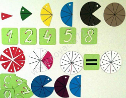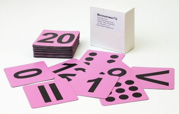 В комплект входят 48 магнитных карточек: по 2 карточки с числами от 1 до 10, по одной с числом 0 и числами от 11 до 20, по одной для знаков действий и символов и по одной с точками, соответствующие цифрам от 1 до 9.