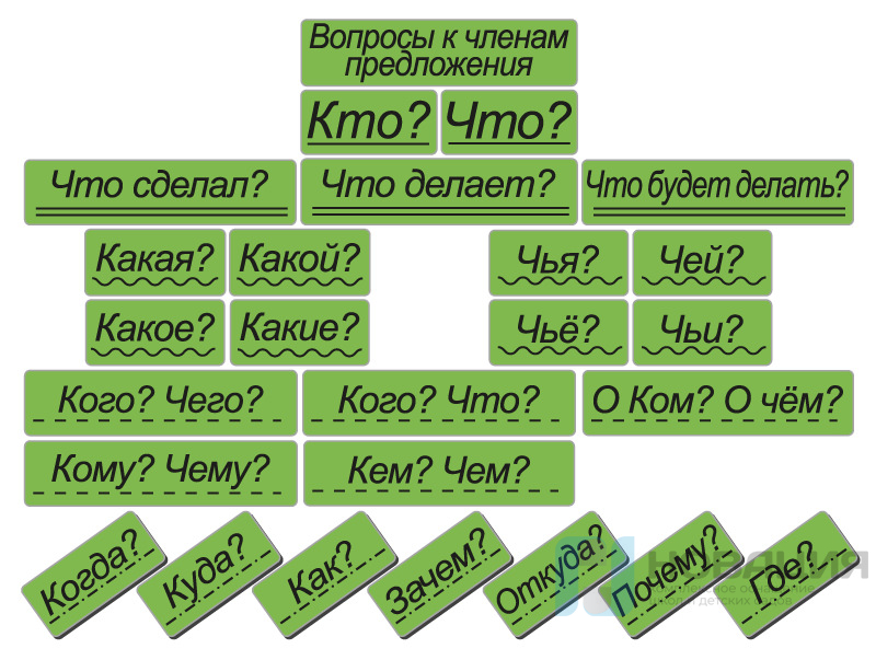В наборе 26 карточек с вопросами, на которые отвечают различные члены предложения. Предназначен для наглядного изучения членов предложения. С помощью набора дети запомнят функции подлежащего, сказуемого, определения, дополнения и обстоятельства.