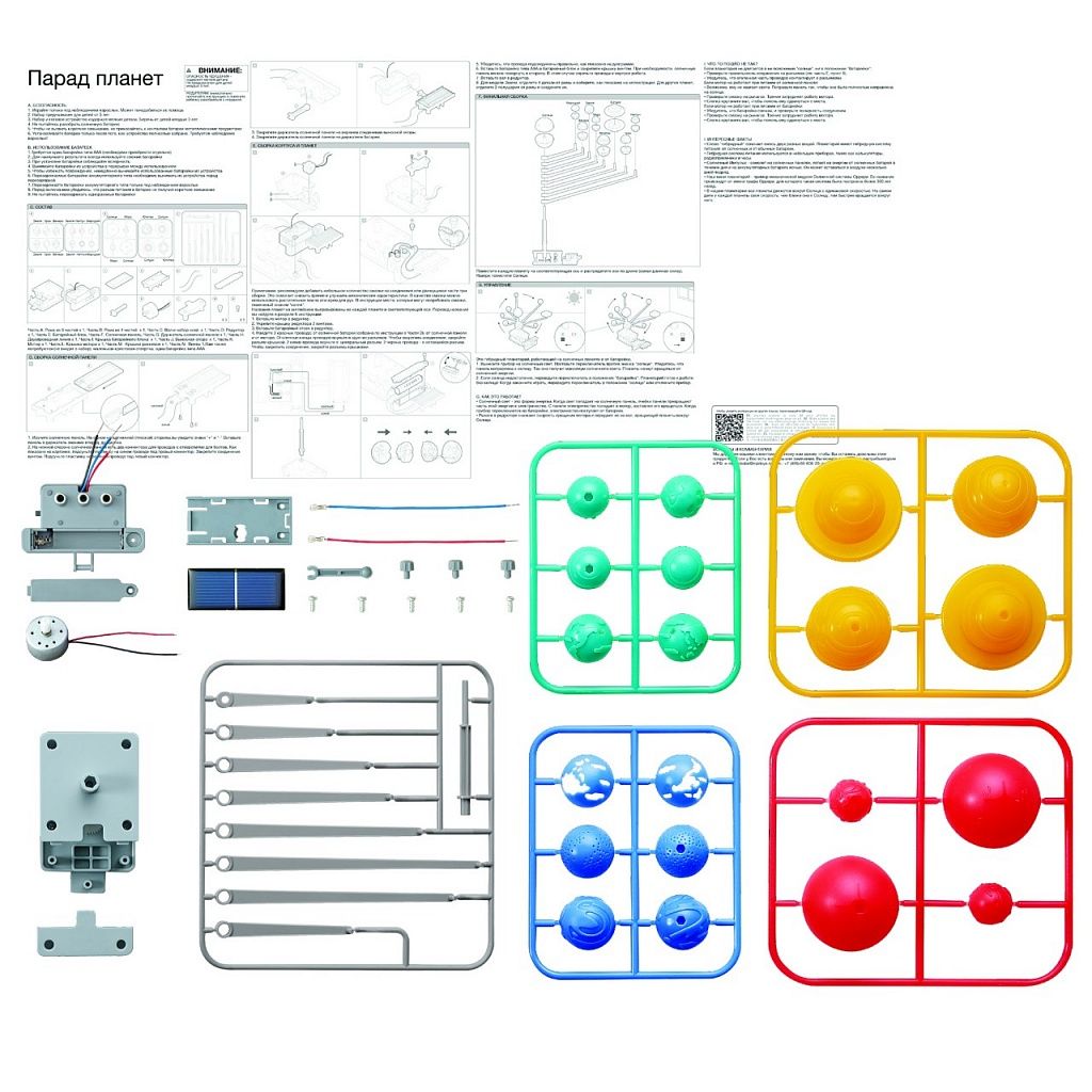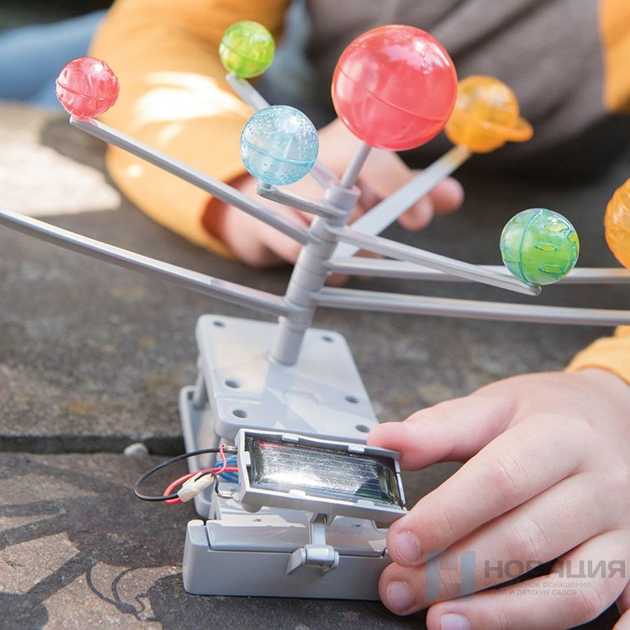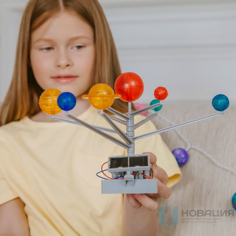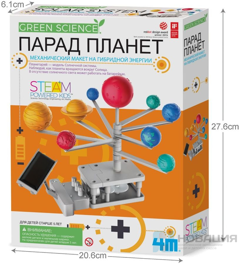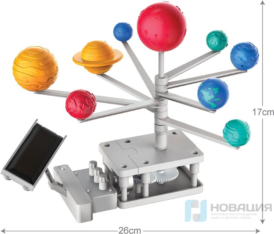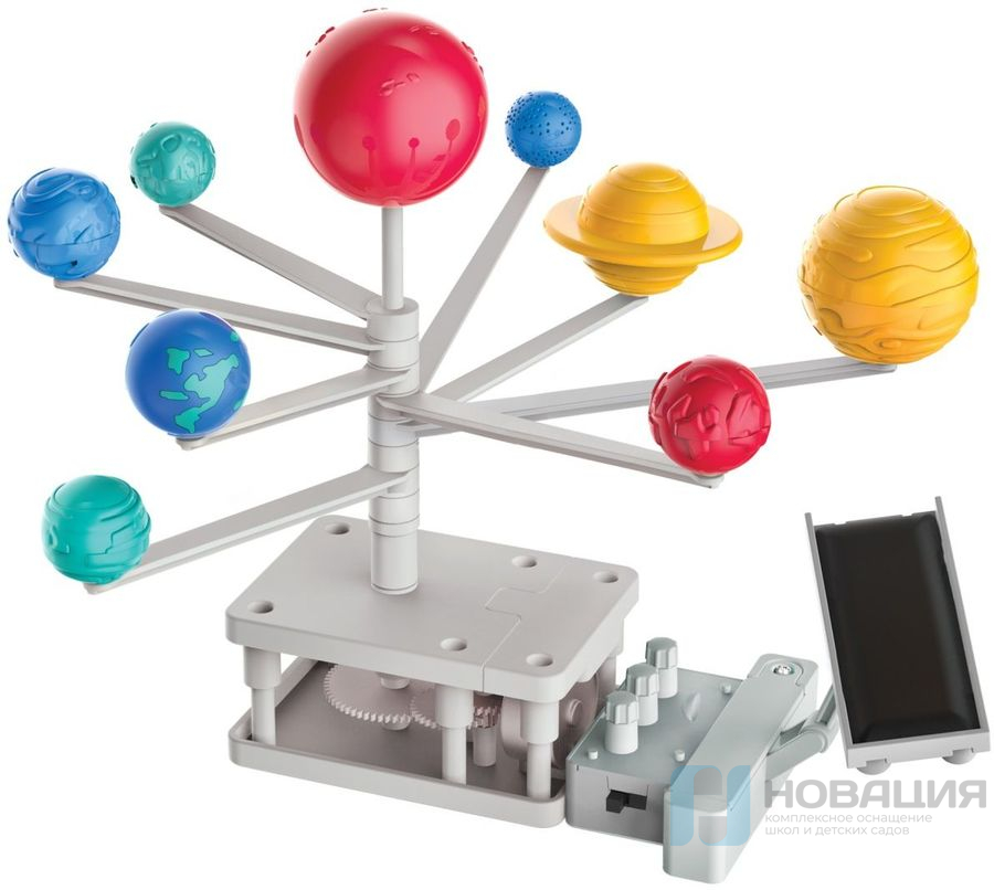 Механический планетарий состоит из 9 макетов на едином основании. Инсталляция питается от батарейки ААА (в комплект не входит). Макеты представляют собой шарообразные модели планет земной группы и Солнца.