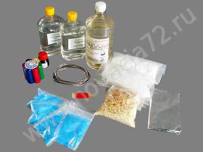 В набор материалов по физике входят различные реактивы для проведения опытов и лабораторных работ: