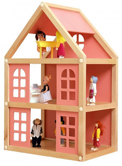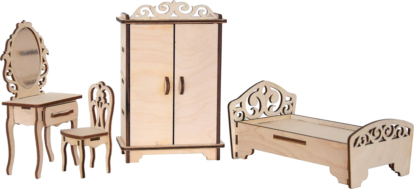 - набор кукольной мебели "Спальня" (шкаф для одежды, кровать, туалетный столик, стул). Дверки шкафа открываются, внутри расположены 3 вешалки для одежды. Ящичек туалетного столика выдвигается;
