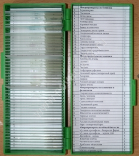 Микропрепараты по ботанике: 1) Плесневый гриб мукор; 2) Пыльцевые зерна; 3) Нитчатая водоросль; 4) Спорогоний кукушкина хвоща; 5) Поперечный срез листа сосны; 6) Мужская шишка сосны; 7) Пыльца сосны; 8) Поперечный срез лишайника; 9) Сорус папоротник; 10) Спороносный колосок льна; 11) Пыльник; 12) Поперечный срез стебля липы; 13) Кожица лука; 14) Лубяные волокна льна; 15) Кончик корня с корневым чехликом; 16) Эпидермис листа герани; 17) Поперечный срез листа фикуса; 18) Лист мха сфагнума; 19) Семяпочка; 20) Поперечный срез стебля клевера.