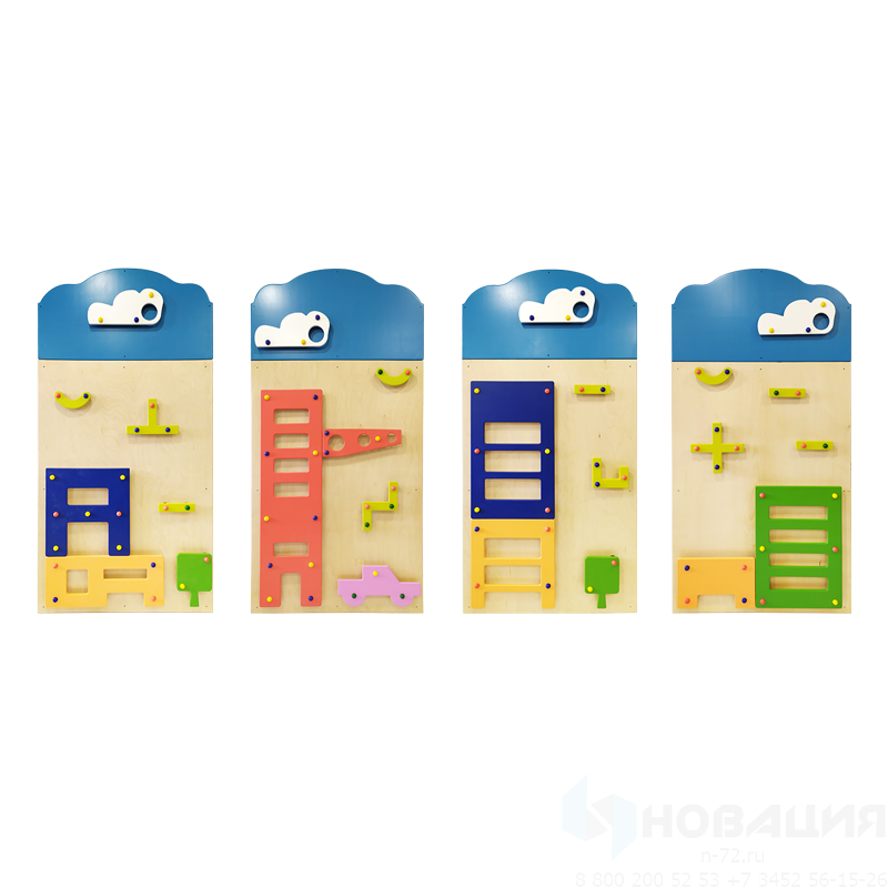Комплект поверхностей для скалолазания монтируется к стене. Включает в себя составные панели с волнообразным верхом. Доски оформлены в городском стиле. Захваты в виде зданий с окнами, автомобиля, строительного крана, математических знаков и фигур помогают подняться наверх без специальной подготовки.