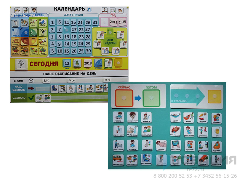 - набор для знакомства с понятиями "Сейчас/потом": 2-хсторонний планшет (ДхШ 900х200 мм, с поощрительным листом), 3 жетона и 30 карточек 4х4 см в конверте.
