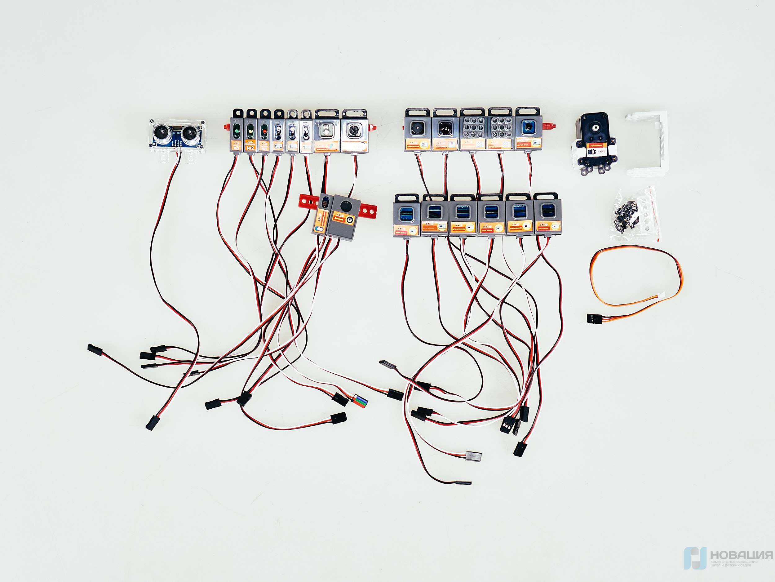 Светодиодные модули подключаются к блоку управления через соединительный провод, который имеет специальный корпус для крепления к конструктору. Датчик звука передает информацию в блок управления о громких звуках или когда звука нет.