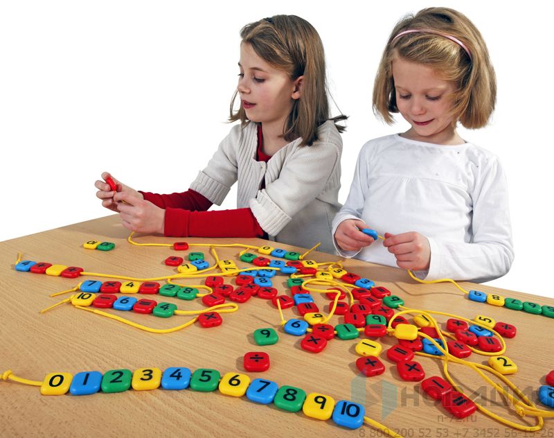 Набор предназначен для групповой деятельности детей в возрасте от 4 до 6 лет. Нанизывая бусины на шнурки, дети учатся устному счету, могут решать простые примеры, развивают мелкую моторику и мышление.