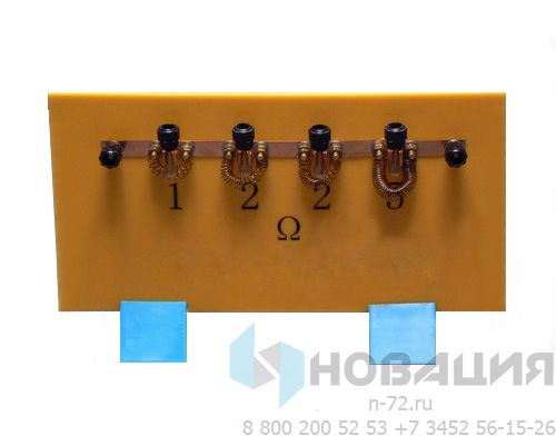 Корпус представлен панелью с 5-ю латунными скобами. На крайних есть 2 зажима для подключения к цепи. Скобы изолированы, соединяются штепселями с пластмассовыми головками. Каждая пара скоб подключается к проволочной спирали. Величины сопротивления спиралей обозначены цифрами.