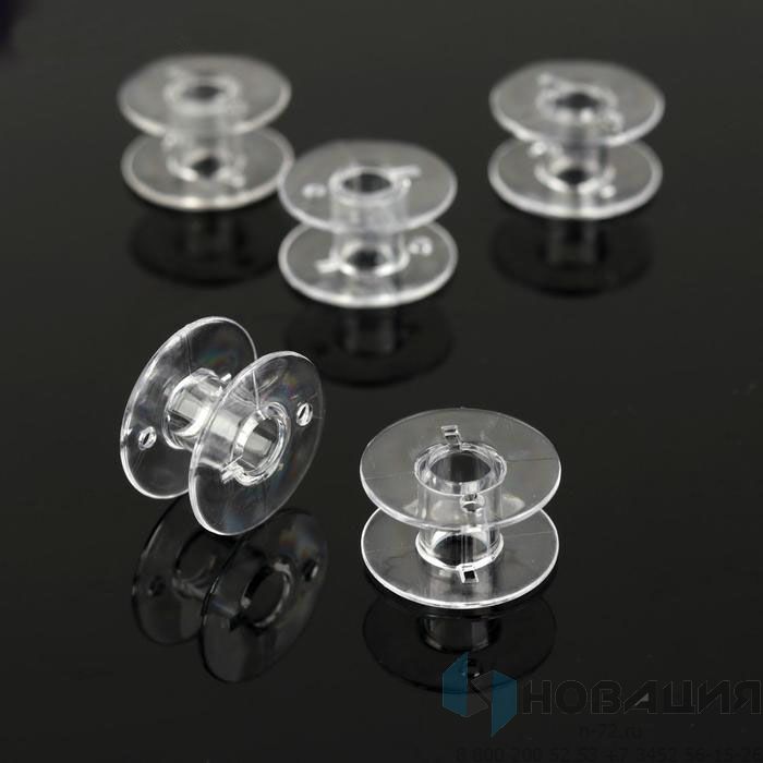 В наборе для швейной машины 5 прозрачных шпулек со внутренним диаметром 6 мм. На катушки наматывается нить. Шпульки подходят для машин Brother, Janome, Aurora, Bernette, Elna.
