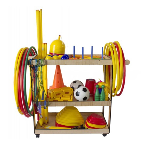 Набор предназначен для применения в детских и школьных спортивных залах. Благодаря удобным колесам и двум ручкам тележку легко перемещать по помещению. Специальное отделение предусмотрено даже для хранения гимнастических палок. Ручки тележки идеально подходят для размещения скакалок и обручей.