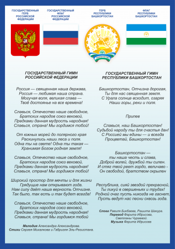 Наклейка содержит информацию об официальной символике государства и отдельного субъекта. Включает тексты гимнов России и области (края). Размещается на парте.