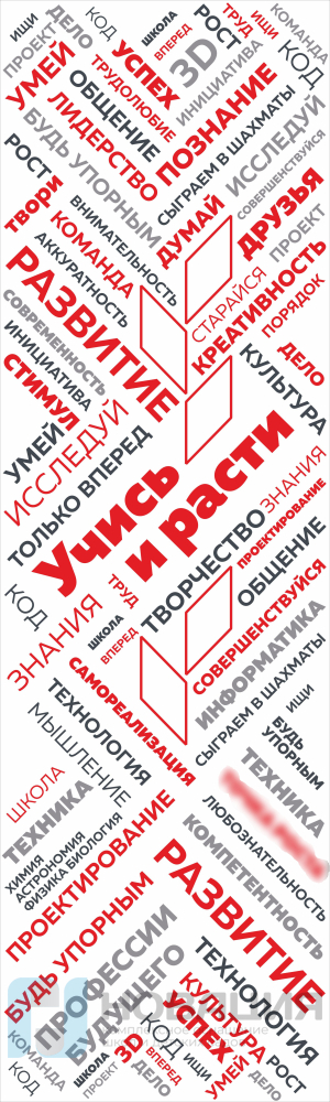 Наклейка “Учись и расти” выполнена в фирменных цветах проекта “ТР”, а также украшена стилизованными элементами.