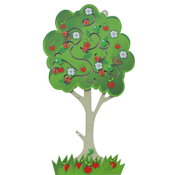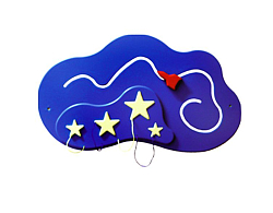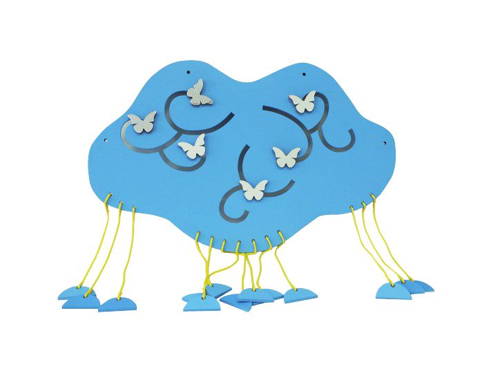 Настенная панель представлена в форме тучи с прорезями разной формы, по которым можно перемещать фигурки бабочек. Для покрытия использованы бесцветный лак и краска на водной основе.