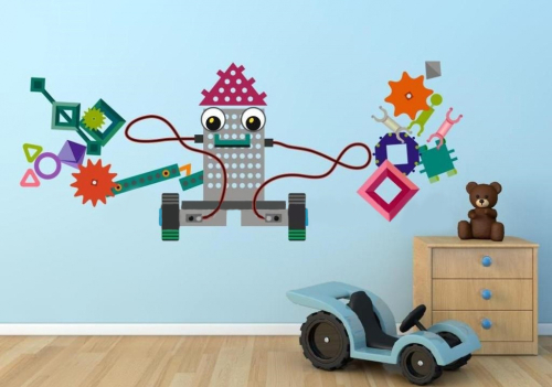 Настенная композиция включает фигуру робота и дополнительные элементы различных форм и цветов. Крепежные элементы входят в комплект.