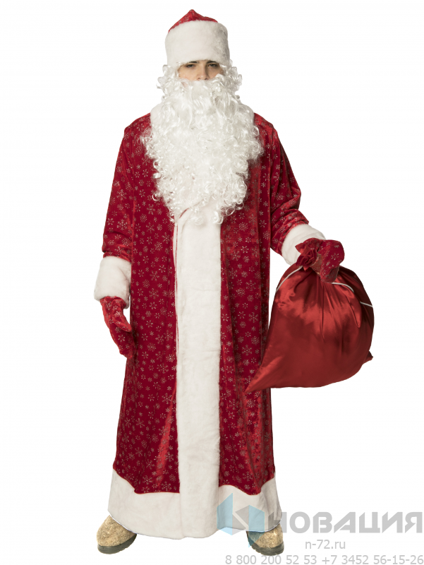 Шуба прямого кроя выполнена из красного бархата, украшенного сияющими снежинками. По краям манжетов, полочек, подола, и воротника, оторочена полосой из искусственного белого меха. Дополняют образ варежки и шапка с отворотом из белого меха, выполненные в цвет шубы. Мешок для подарков пошит из креп-сатина в красном цвете.