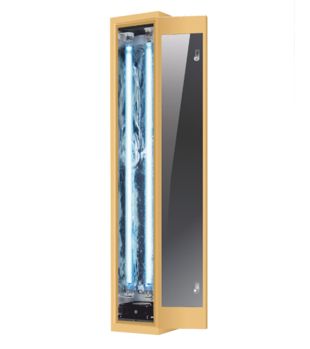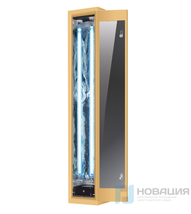 Дверца корпуса запирается на ключ. Облучатель комплектуется двумя бактерицидными лампами. Срок службы ламп составляет 9000 часов. На боковой стороне корпуса установлен двухцветный индикатор, который информирует об окончании срока использования ламп.