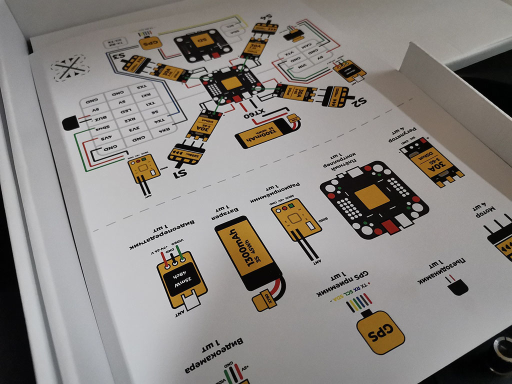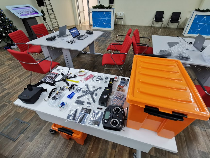 На борту размещены: лазерный дальномер, датчик оптического потока, барометр. Видео с дрона передается на специальные очки из комплекта. Такие занятия – первый шаг к профессии оператора БПЛА. Знакомство с техническим творчеством позволит в дальнейшем создавать собственных роботов.