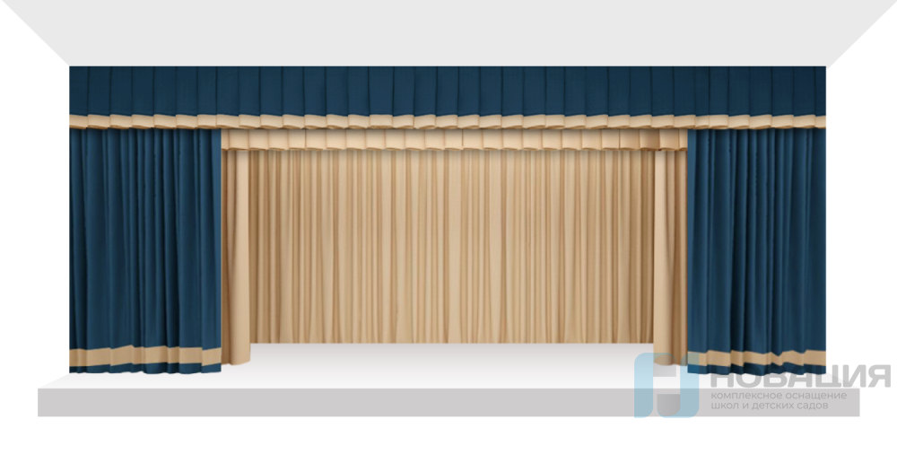 Сценическое оформление выполнено из специализированных тканей, обладающих повышенной огнеупорностью и сохраняющих свойства после стирки или химчистки.
