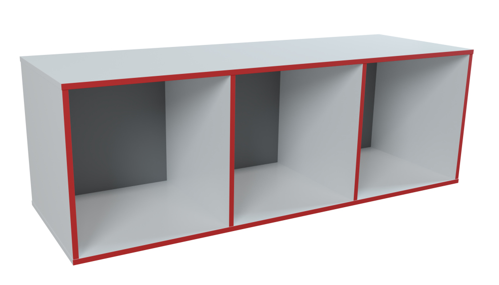 Настенная полка для проекта "ТР" крепится к стене. Задние стенки 3-х полуоткрытых отделений изготавливаются из ХДФ. Изделие поставляется в белом цвете, кромки корпуса на лицевой стороне красные. Возможно изготовление мебели по индивидуальному заказу.