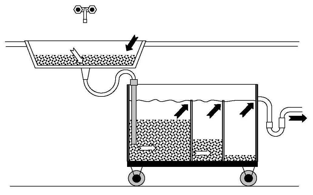 Сепаратор предназначен для очистки воды и предотвращения попадания глины в канализацию. Резервуар состоит из трёх ёмкостей. Оснащён четырьмя колёсами. Отстойник необходимо устанавливать между раковиной и сточной трубой. Бак нужно периодически очищать от грязи.