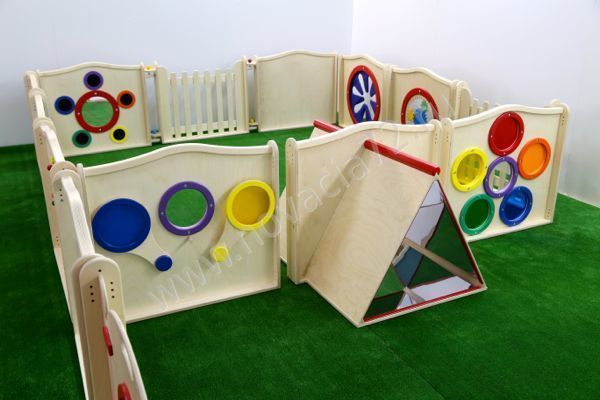 В корпусе панели размещены 5 тканевых мешочков в круглых отверстиях с разноцветными рамами, а также круглое зеркало. Тканевые мешочки можно заполнять различными материалами - камешками, маленькими игрушками и пр. Игры с панелью способствуют сенсорному развитию.
