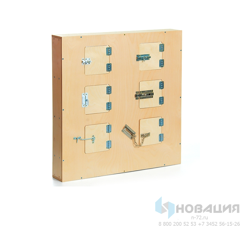 Вертикальная панель с дверцами на замках помогает развить познавательный интерес у ребенка. Щеколды, крючки и цепочки нужны для тренировки пальцев. За створкой можно спрятать поощрительный приз.
