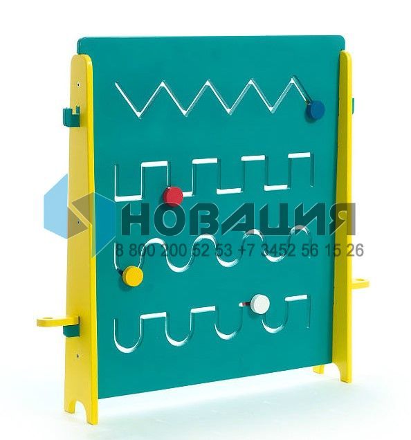 Панель на боковых опорах представляет собой поле с тактильными лабиринтами. Дошкольник перемещает элементы в прорезях. Траектория продумана таким образом, чтобы подготовить кисть ребенка к письму. Подходит для ОВЗ.