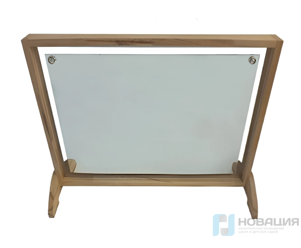 Мольберт на стойке шириной 400 мм оснащен отражающей поверхностью. Дугообразный верх конструкции украшен отверстиями. 2-хстороннее изделие служит рабочим полем художника и зеркалом.