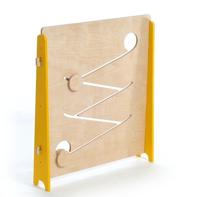 Вертикальная панель с парными боковыми ножками служит полем для тренировки моторики рук. Дошкольник ведет элемент по резному лабиринту. Занятие подходит детям с ОВЗ.