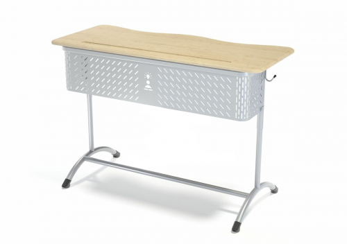Двухместный стол рассчитан на несколько ростовых групп. Разборный каркас меняет высоту. Дугообразные ножки усилены перекладиной. На столешнице с выемками есть желоб для письменных принадлежностей. Под крышкой по бокам закреплено по одному крючку.