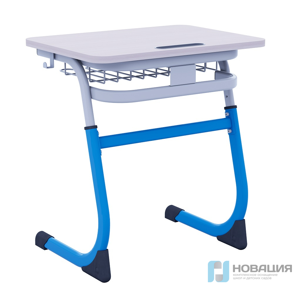 Парта регулируется по высоте. Сборно-разборный каркас парты изготовлен из стальных плоскоовальных труб и состоит из пояса, двух стоек, перемычки и двух опор. Стойки крепятся к поясу при помощи винтов. Опоры вставляются в нижнюю стойку и стягиваются между собой. Столешница крепится при помощи металлических уголков, под ней размещается корзина для книг и канцелярии (размеры ШхГхВ - 475х310х100мм).