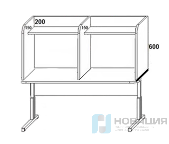 Оснащена надстройкой высотой 600 мм, в которую встроена полка глубиной 150 мм и перегородкой по центру. Лицевые углы столешницы и надстройки скруглены.