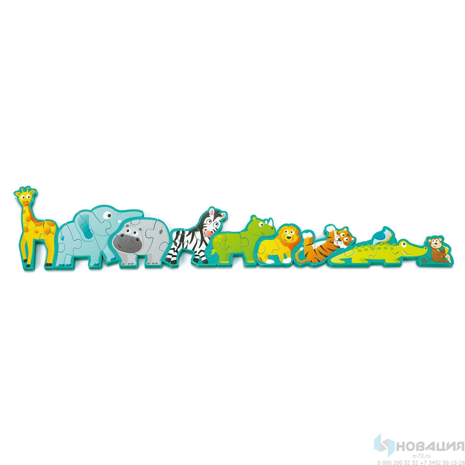 Пазл с изображением животных и буквами английского алфавита на обратной стороне будет полезен для развития мелкой моторики и способности к решению различных задач, обучению иностранным языкам.
