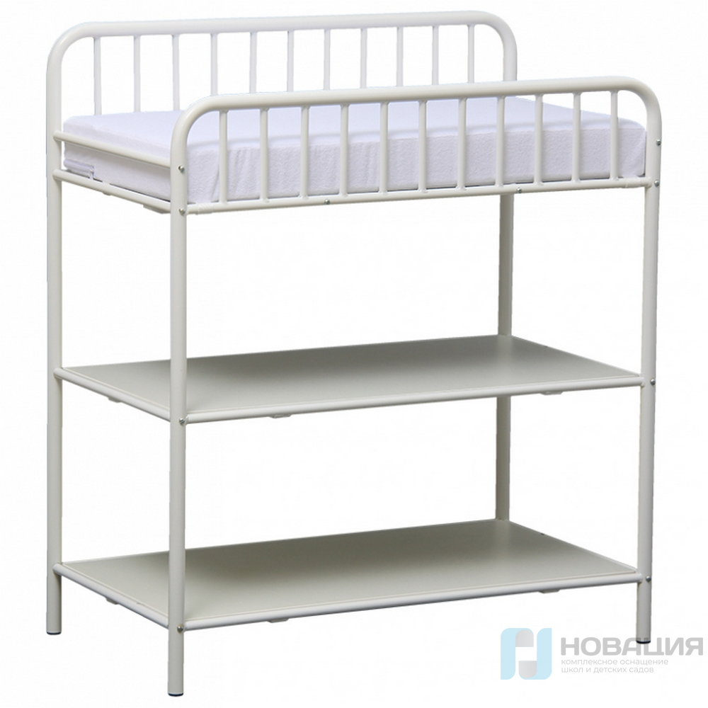 Столик оснащен 3-мя полками (по 430х820 мм) и матрасом (820х420 мм) на мембранной основе. Верхняя площадка используется при пеленании ребенка, на нижних 2-х ярусах можно хранить пеленки и косметические средства. Конструкция на 4-х ножках устойчива, верхний ярус окружается закругленными решетчатыми бортами и боковыми перекладинами.