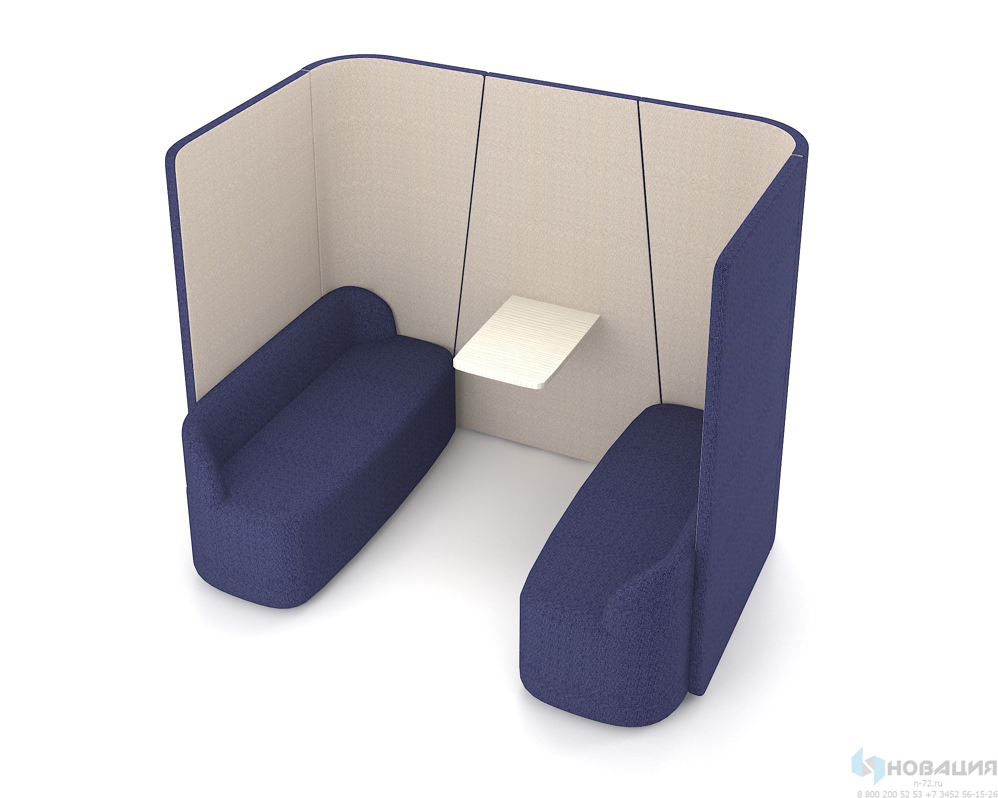 Переговорной зоной со столом оснащаются коворкинги, помещения для отдыха, читальные залы. Разборная конструкция занимает 3,016 кв.м. Участок с 3-х сторон огораживается вертикальными панелями. Вдоль боковых стенок стоят мягкие диваны со спинками (по 1 шт.), между ними к панели монтируется столешница из ЛДСП (25 мм) с закругленными углами. Перегородки поглощают шум. Обивка выдерживает не менее 20000 циклов истирания.